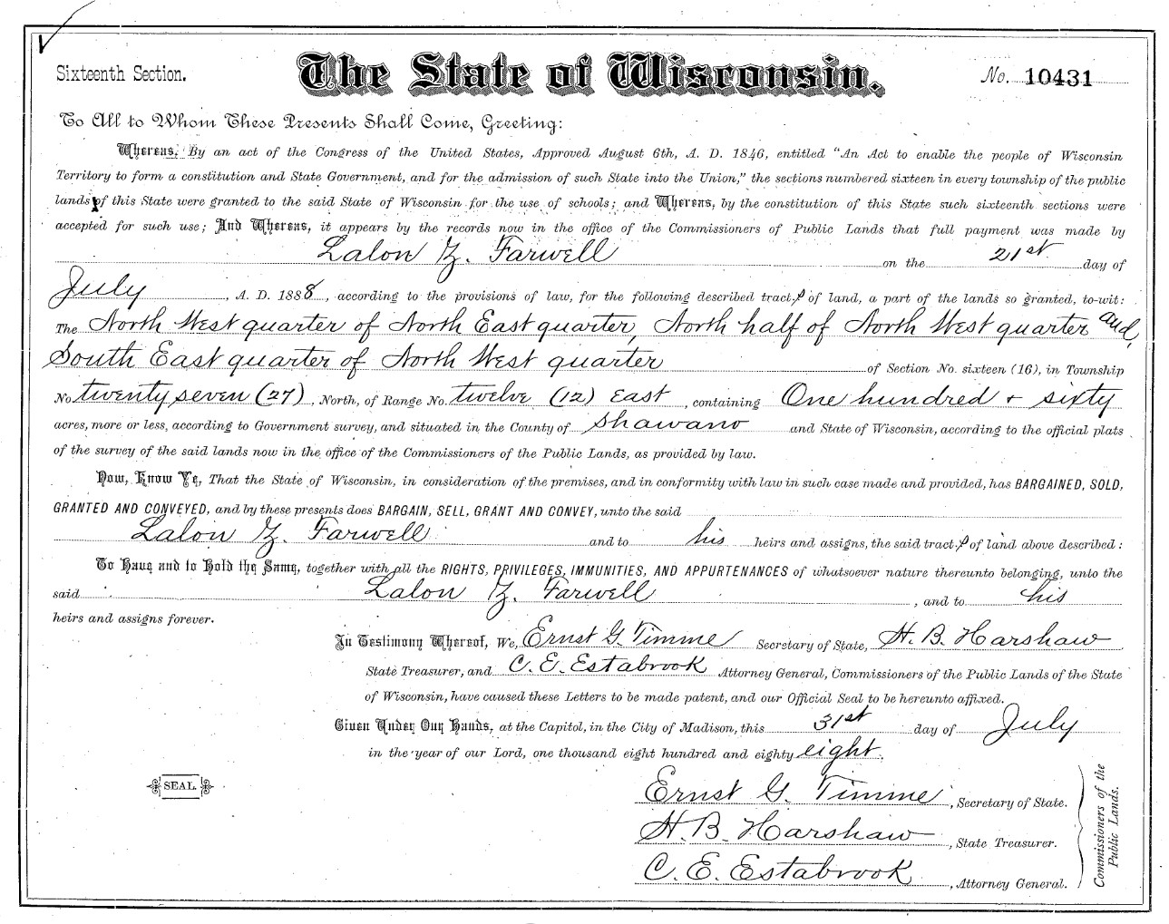 These documents are the official written instruments that were used to transfer the ownership or “title” of lands granted by the United States government to the State of Wisconsin. Wisconsin received a number of different land grants supporting education, including:
